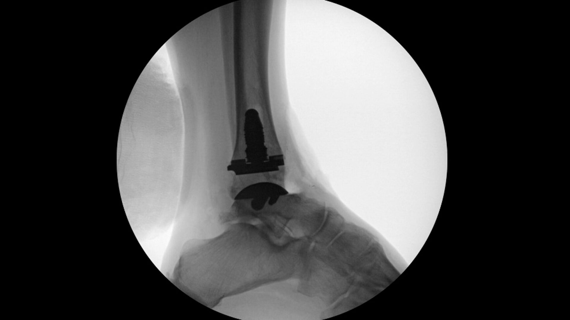A 57-year-old patient presented with longstanding ankle pain refractory to conservative treatment. Prior nanoscopic debridement with platelet rich plasma injection provided only six months of relief. Imaging demonstrated significant joint space narrowing, subchondral sclerosis, exostoses at the talar neck, subtalar joint, talar gutters, as well as a cavovarus hindfoot alignment consistent with end-stage ankle arthritis.