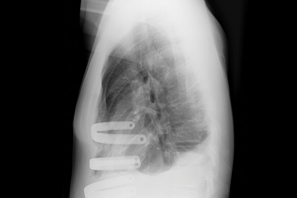 The minimally invasive repair of adult pectus excavatum required cryoablation and three titanium bars, but the patient went home the next day.
